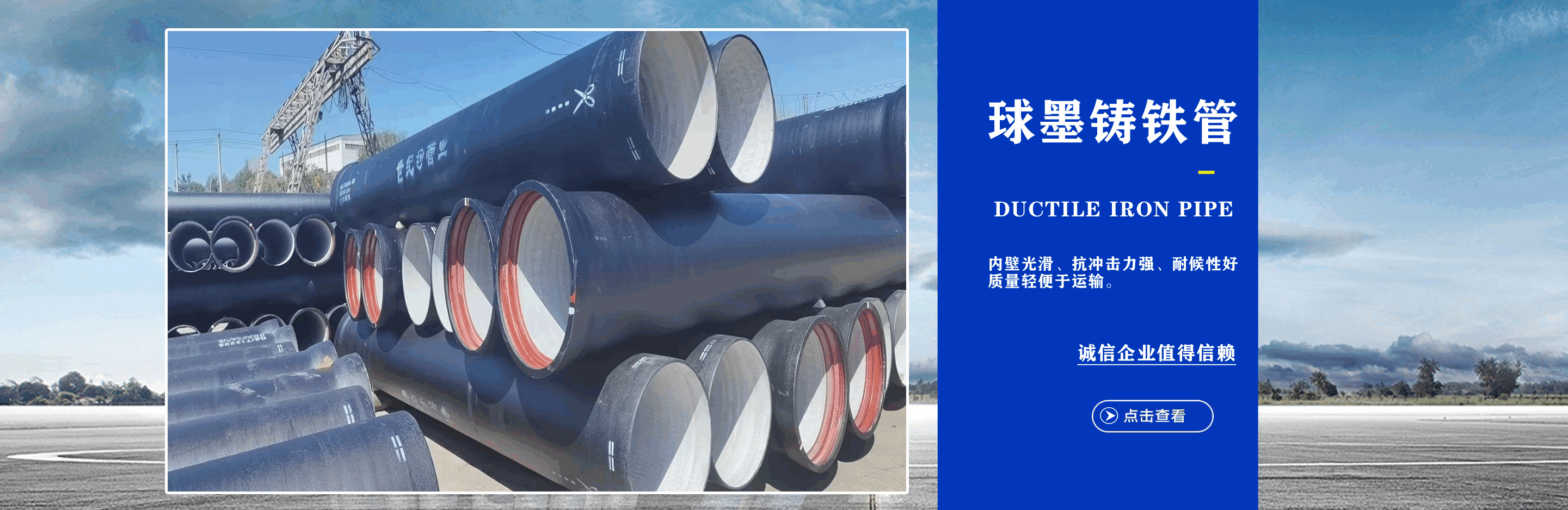 青島世紀(jì)球墨鑄鐵管業(yè)有限公司主營DN80mm~DN2600mm球墨鑄鐵管,給排水球墨鑄鐵管,球墨鑄鐵頂管,自錨式球墨鑄鐵管,球墨鑄鐵保溫管,球墨鑄鐵管件,柔性排水鑄鐵管,球墨鑄鐵井蓋,雨篦子等產(chǎn)品。我公司實力雄厚,常備萬噸庫存,貨源充足,規(guī)格齊全,發(fā)貨速度快! 青島世紀(jì)管業(yè)嚴(yán)格執(zhí)行“精益求精,增強顧客滿意;精益求進,實現(xiàn)持續(xù)發(fā)展”的質(zhì)量方針,建立起完善的售前咨詢、售中安裝、售后回訪服務(wù)體系,真誠地與用戶建立起長期密切合作關(guān)系。優(yōu)異的產(chǎn)品和良好服務(wù)受到廣大用戶的青睞,是您值得尊敬和信賴的合作伙伴。 青島世紀(jì)球墨鑄鐵管業(yè)始終堅持“誠信立業(yè),追求卓越,合作共贏,共同發(fā)展”,竭誠歡迎各界朋友來廠參觀指導(dǎo),洽談業(yè)務(wù)。我們愿與您攜手共進,互惠雙贏,共創(chuàng)未來!...